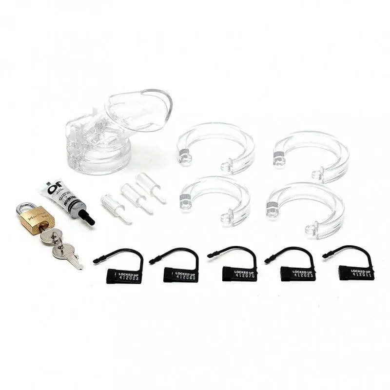 Deze nieuwe kuisheidskooi maakt gebruik van een nieuw concept cockring die bestaat uit drie onderdelen die als een puzzel precies in elkaar vallen. De twee geleidings-pinnen houdt de kooi op zijn plek ten opzichte van de cockring. De slotpin in het midden die verzonken is in de cockring verbindt het geheel onlosmakelijk aan elkaar. Het nieuwe platte ontwerp van de cockring is enorm comfortabel. In het pakket CB6000 zitten vijf verschillende maten ringen: 1 ½” (38 mm), 1 5/8” (41 mm), 1 ¾” (45 mm), 1 7/8” (48 mm) en 2.0” (51 mm) binnendiameter. De kooi heeft een lengte van 3 ¼” (83 mm) en een binnendiameter van 1 3/8” (35 mm)