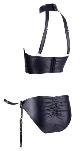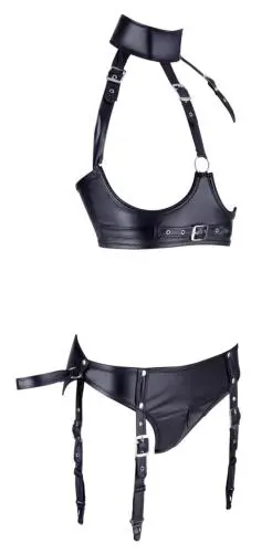 Breng je visueel avontuur naar een hoger niveau, ontdek deze spannende BH set met afneembare jarretelgordel. Alle bandjes van het setje zijn ruim verstelbaar zodat je verzekerd bent van een goede pasvorm. De open cups en rits bij het slipje geven het een uitdagende look en de afneembare handboeien maken dit setje perfect voor een spannende bdsm avond. Maak de look compleet met een paar mooie kousen.