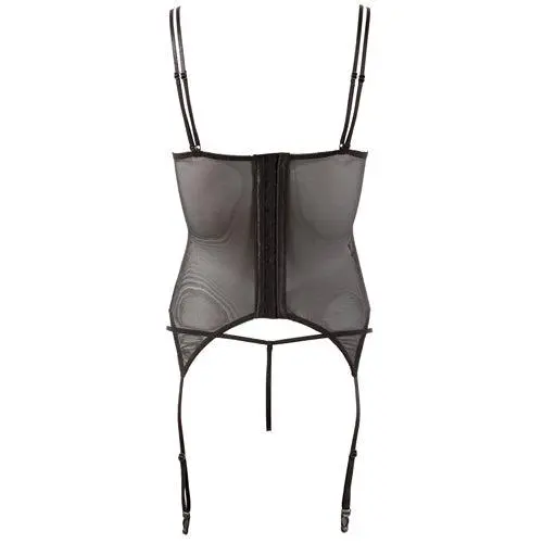 Bustier gemaakt van kant en elastisch satijn. De cups kunnen verwijderd worden met behulp van kleine knoopjes waardoor open cups worden gecreëerd. De bandjes zijn verstelbaar en een bandje is te verwijderen. Met haaksluiting op de rug. Met vier aanpasbare jarretel bandjes. Inclusief string. Zonder kousen.