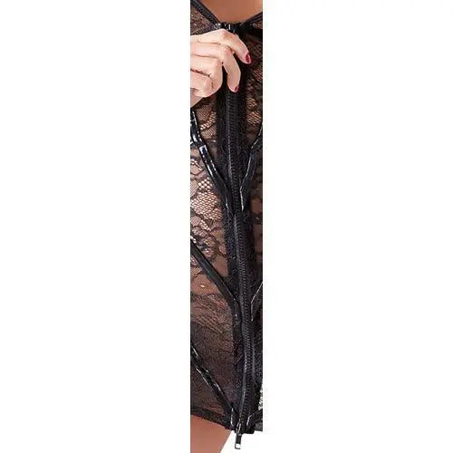 Laat je van je meest verleidelijke kant zien in dit spannend en verleidelijk jurkje van Cottelli Collection! Het zwart kanten jurkje schijnt door waardoor er veel van je lichaam zichtbaar blijft. Het jurkje is voorzien van wetlook details voor een ruig randje en heeft een extra lange rits aan de voorkant die helemaal open kan. Hierdoor bepaal jij zelf hoe snel je je jurkje uitdoet wanneer het echt spannend wordt!