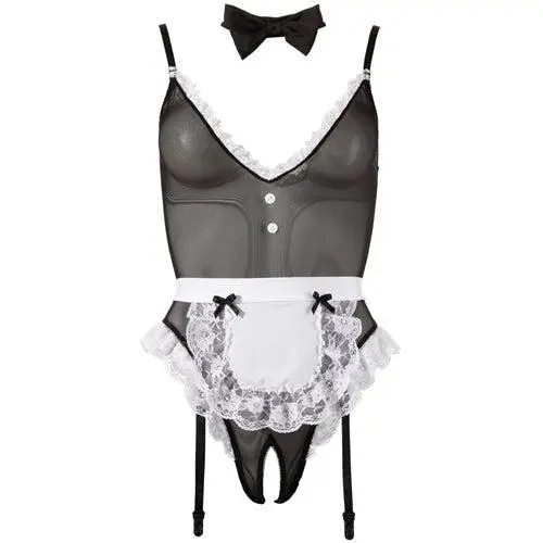 Ervaar het perfecte rollenspel met deze serveerster outfit! De body is gemaakt van netstof en heeft kanten details en een open kruis. Met verstelbare bandjes. Ook de jarretels zijn verstelbaar en verwijderbaar. Inclusief schortje en halsband met strikje en klittenband.