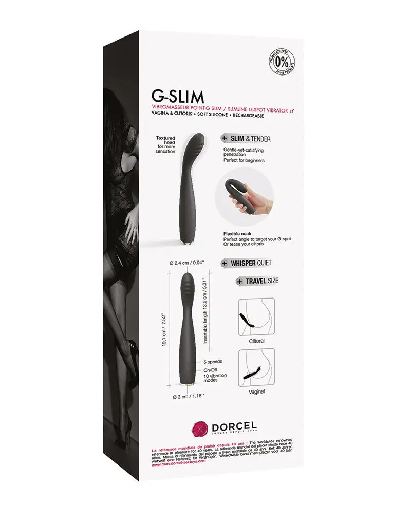 G-Slim is een ultradunne G-spot vibrator die zorgt voor een lichte en zachte penetratie en ultieme flexibiliteit waardoor de vibrator de G-spot met precisie kan verwennen. Deze G-Spot vibrator biedt 10 vibratiestanden en 5 intensiteitsstanden.