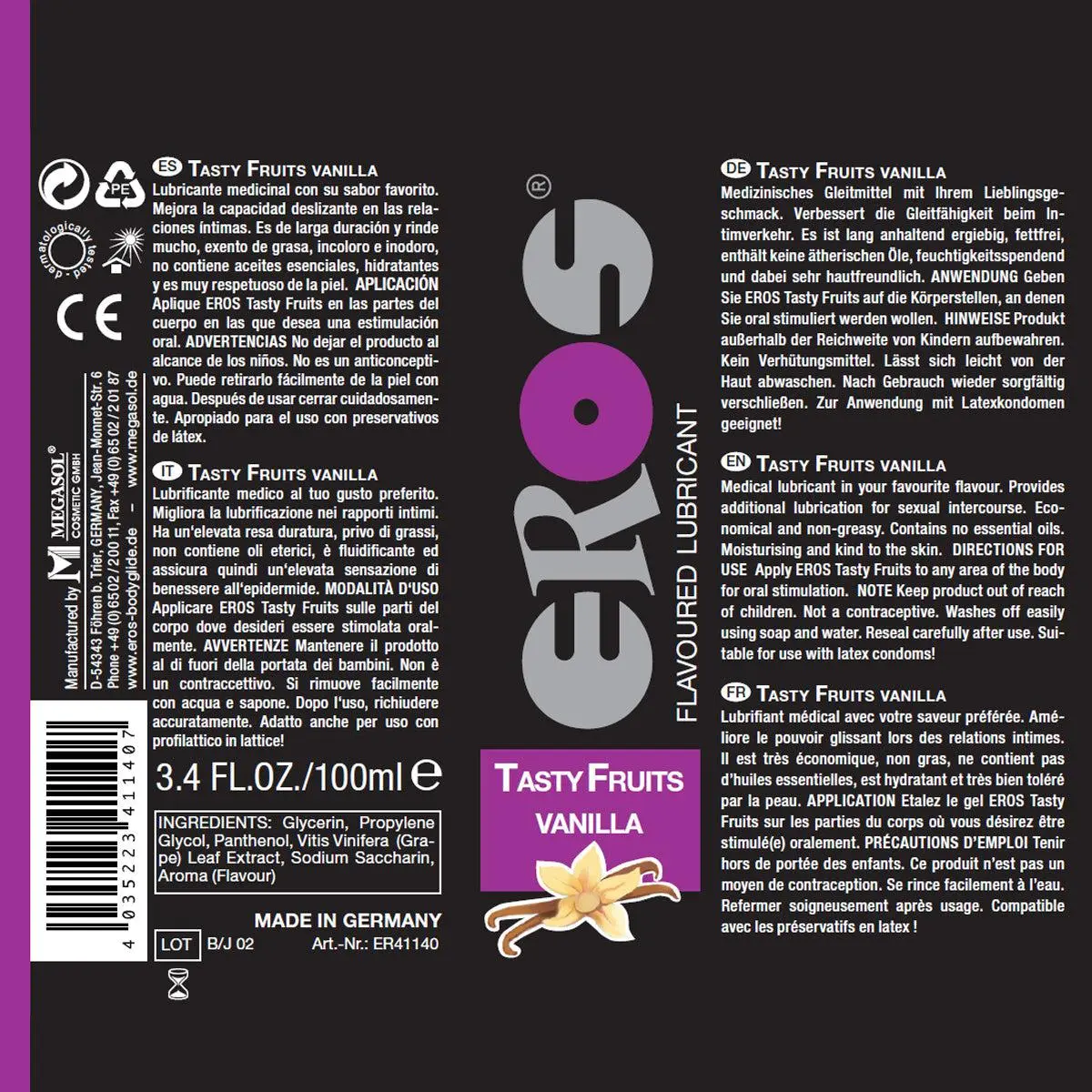 Tasty Fruits vanille heeft een geweldige smaak! EROS biedt een uniek glijmiddel voor prikkelend erotisch spel met je partner. De opwindende fruitige smaak vergroot het orale genot en zorgt voor allerlei verrassingen. Ben je in de stemming? Tasty Fruits stimuleert je passie! Verbeterd glijvermogen met een extra portie vocht voor je huid!