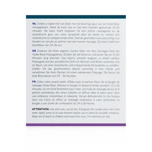 Laat je masseren of masseer je partner met deze Exotiq massagekaars. Steek de kaars aan en geniet van de heerlijke viooltjes en rozengeur die zich door de kamer verspreidt. Laat de kaars 15-20 minuten branden en giet dan voorzichtig het gesmolten kaarsvet in je handen. Gebruik deze warme massageolie om je partner te verwennen met een ontspannende massage.