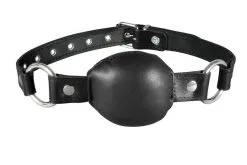Leg je partner het zwijgen op met deze zacht lederen mondknevel met o-ringen, waar je kettingen, touwen of wat je maar wilt aan vast kunt maken. De mondknevel is gefabriceerd in Europa en van hoge kwaliteit en heeft een doorsnee van 6 cm. Aan de achterkant is een verstelbare riem met gesp, zodat je deze zo strak of los kunt maken als jij wilt.