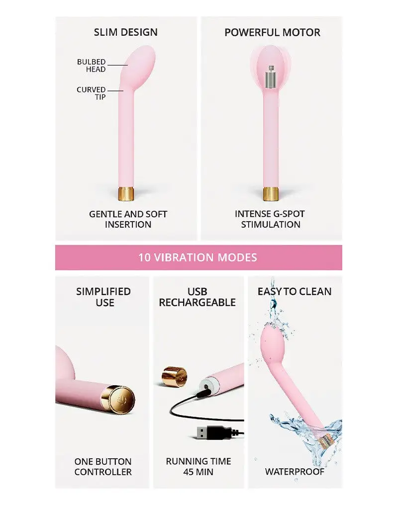 O.M.G. heeft een gebogen punt die perfect is om de g-spot te stimuleren. Met de enkele knop navigeert u eenvoudig tussen de 10 verschillende vibratiestanden. De ultrazachte siliconen met een fluweelachtige textuur is glad en veilig voor de huid.