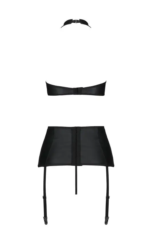 3-delige set gemaakt van imitatieleer. De top en de jarretelgordel hebben verleidelijke bandjesdetails en sluiten aan de achterkant met haakjes. De string heeft een open kruis. Nauwsluitende pasvorm. Een verleidelijk setje voor een spannend avontuur. Exclusief afgebeelde kousen.