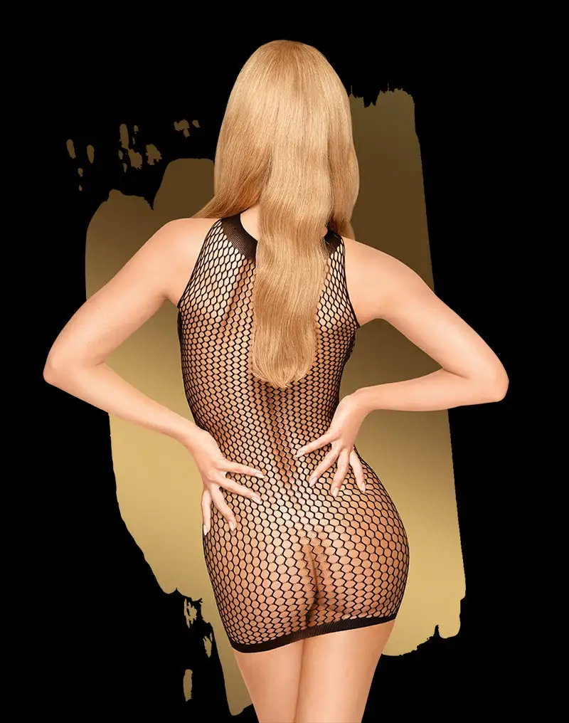 Ride or Die is een naadloze, zwarte, mini jurk gemaakt van fijne mesh, met een hoge halslijn.