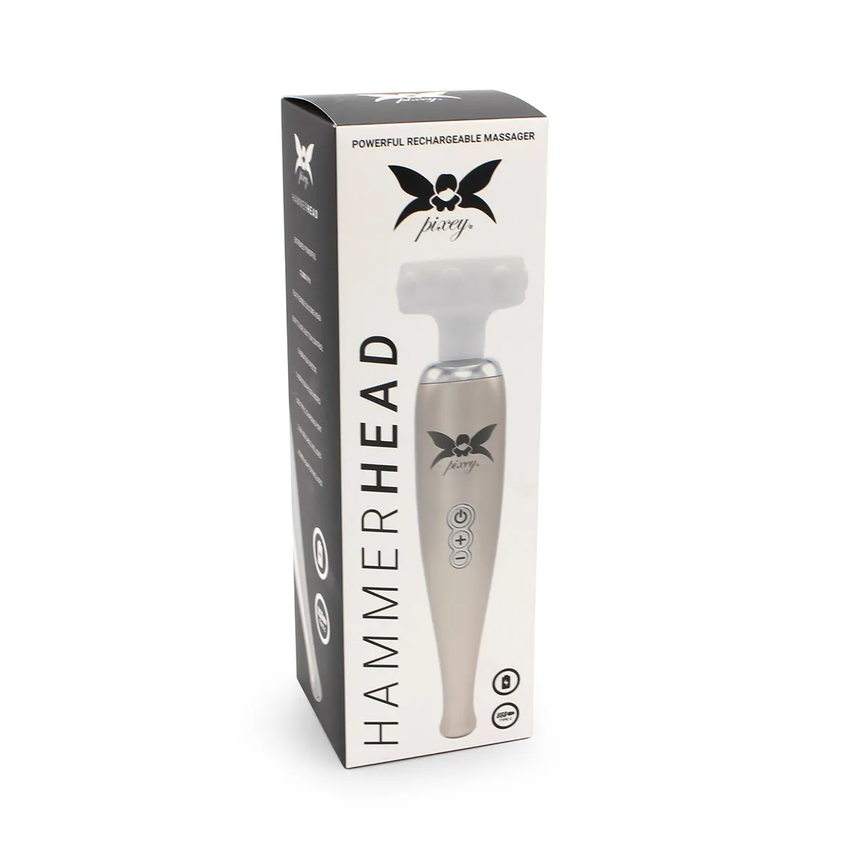 Zet de Pixey Hammerhead aan door op de aan/uit knop te drukken. De Pixey Hammerhead schakelt nu de gemiddelde vibratie-instelling in, druk op de plus- of min-knoppen om de vibratie-intensiteit te verhogen of te verlagen.