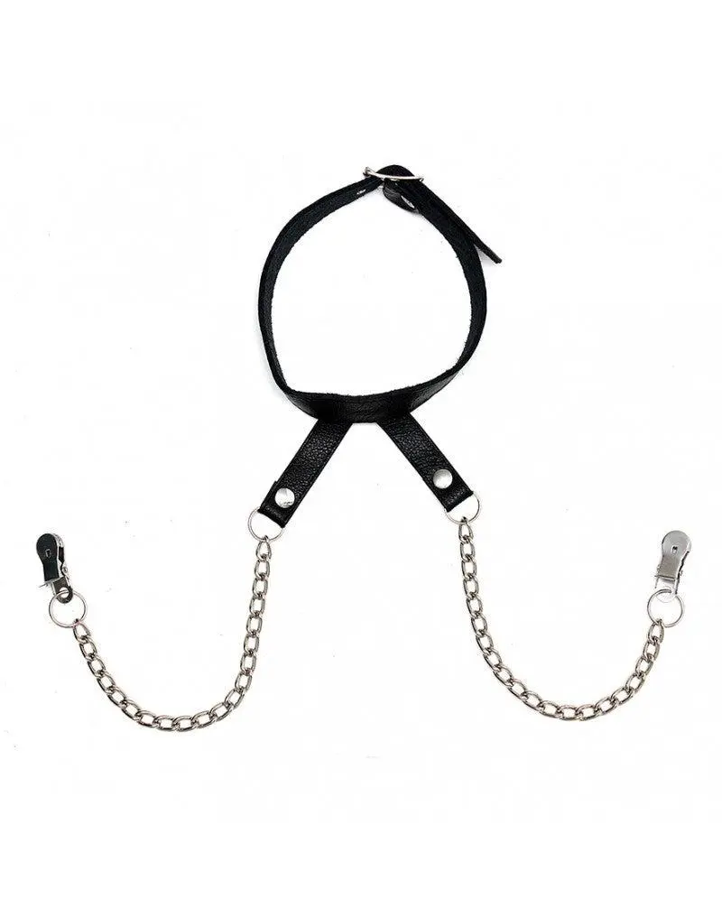 Metalen tepelklemmen met ketting aan halsband van dubble leder. Verstelbaar met gesp.