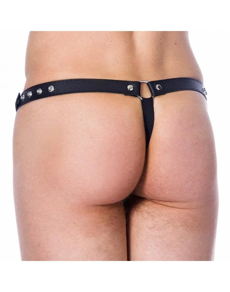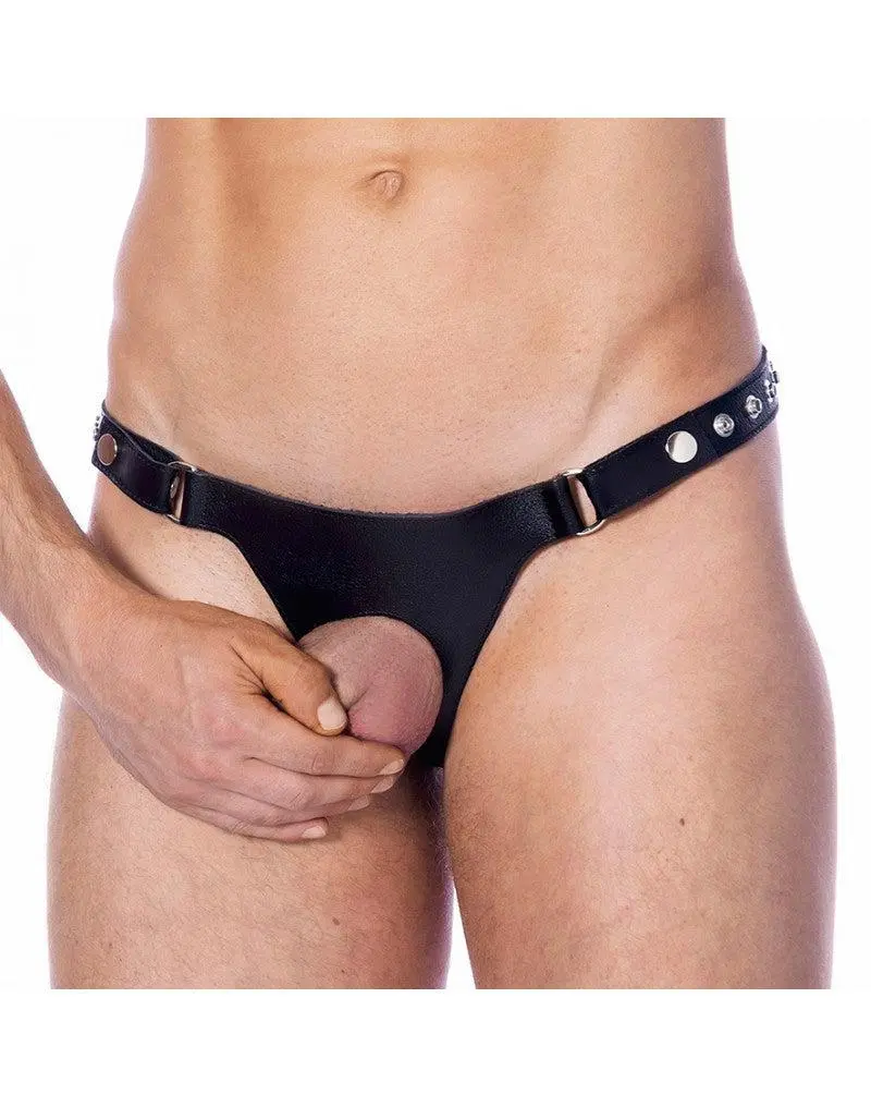 Rimba Bondage Play. Echt lederen herenstring met opening van 5 cm. voor de penis. Het sluiten gaat met drukkers aan de zijkanten en aan de onderkant.