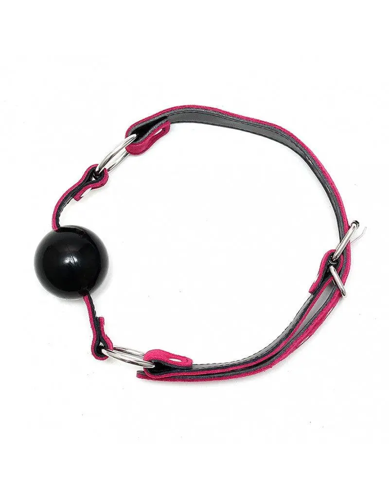 Lederen mondknevel in pink met een zwarte siliconenbal van 44 mm. in doorsnede. Deze mondknevel is te sluiten met een gesp aan de achterzijde over 7 posities.