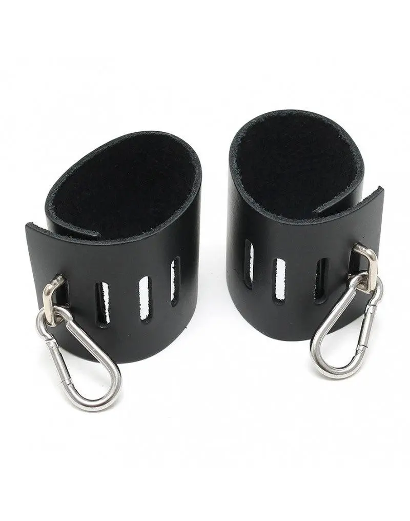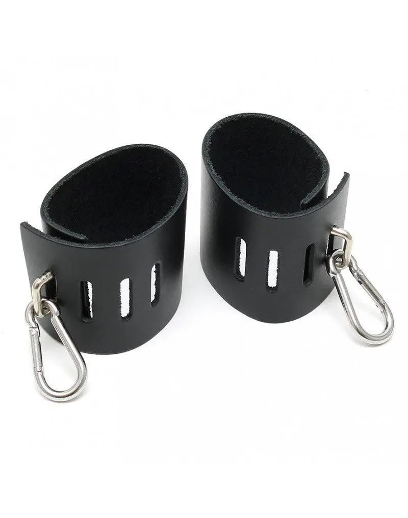 Basis enkel lederen handboeien die verstelbaar zijn door middel van de beugels en karabijn haken. Smal model. Max diameter: 6,5 cm Breedte: 6,5 cm Materiaal: zwart leder