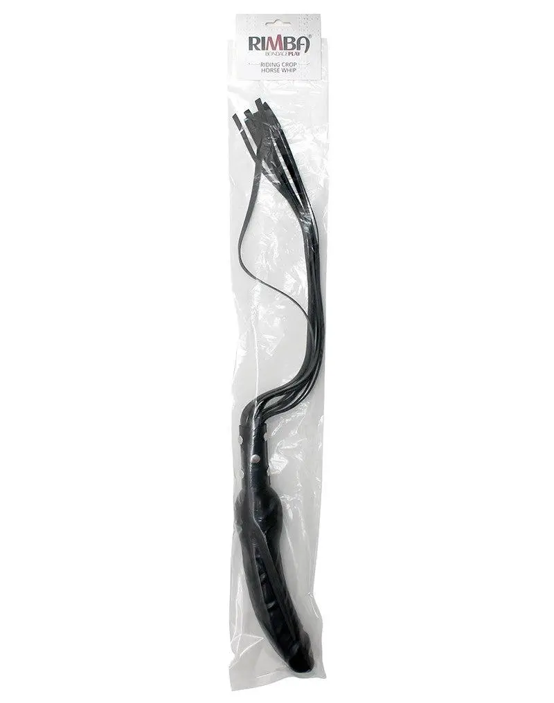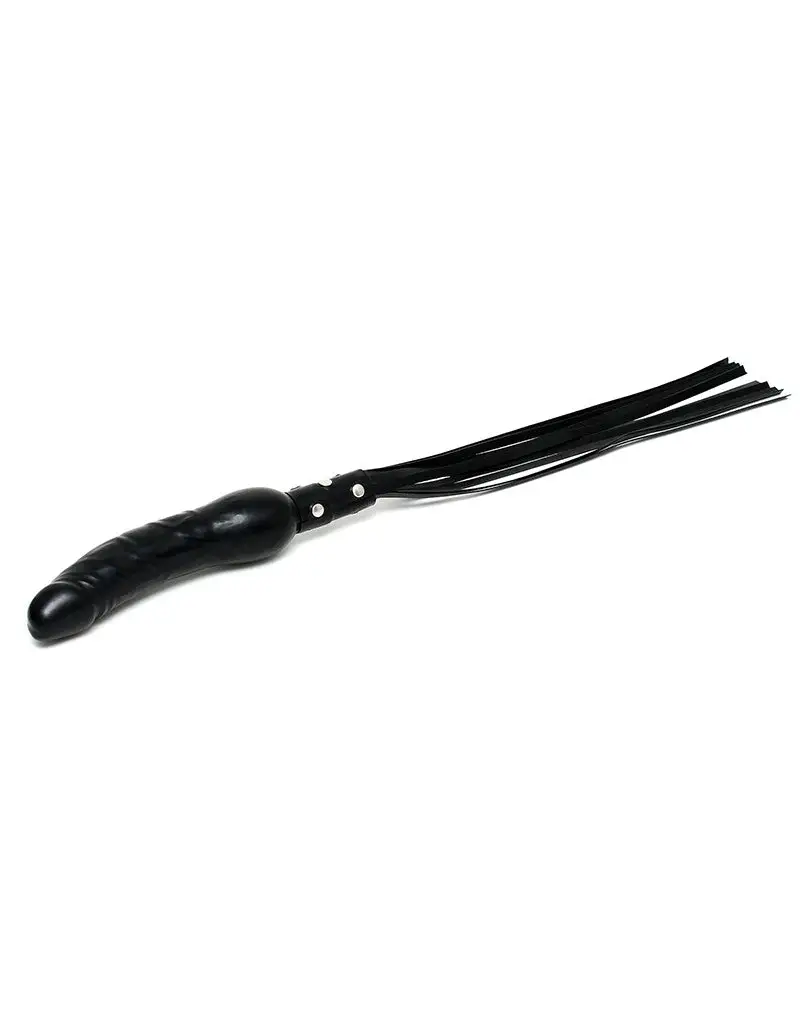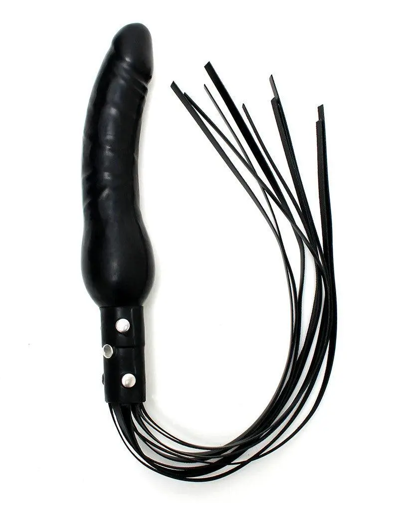 Deze zwarte latex dildo kan tegelijkertijd als zweep gebruikt worden. De dildo heeft zilverkleurige details en de zweep bestaat uit verschillende leren strengen.
