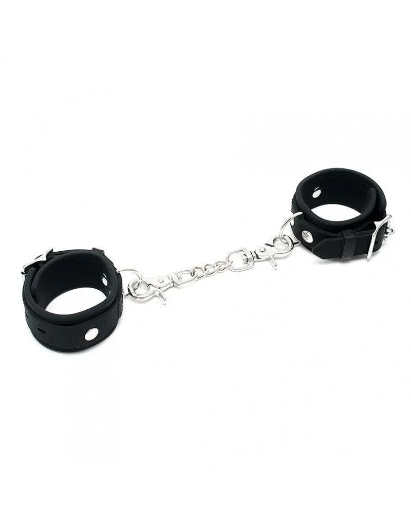 Rimba Bondage Play Siliconen dames boeien van slechts 4 cm breed en zijn verstelbaar met gespen en banden met 5 gaatjes. De boeien zijn verbonden met een metalen ketting met karabijn haken aan beide uiteinden. Materiaal: Siliconen / Stainless Steel Maat: Verstelbaar met gespen Kleur: Zwart