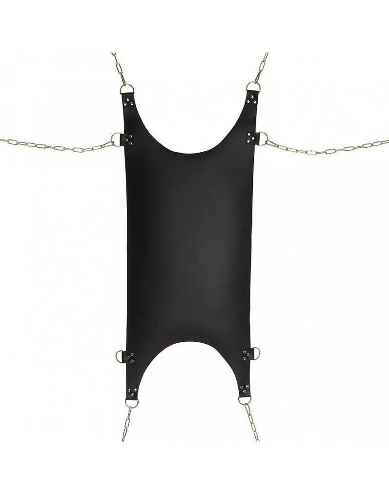 Sling / Hangmat met D-Ringen Sling / hangmet met D ringen gemaakt van zwart leder, afmeting 44 x 110 cm. 2,8 mm dik en maximaal draag vermogen is 85 kg Zwart leder 44 x 110 cm. 2,8 mm dik, max belasting 85 kg, wordt geleverd zonder kettingen.