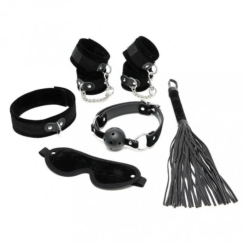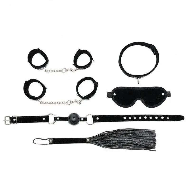 Let’s Play Soft bondage set: Blinddoek + Mondknevel + Handboeien + Voetboeien + Halsband + Zweep. Deze set is verkrijgbaar in Roze/Zwart (7023) Materiaal: Nylon Maat: Verstelbaar met klittenband Kleur: Zwart