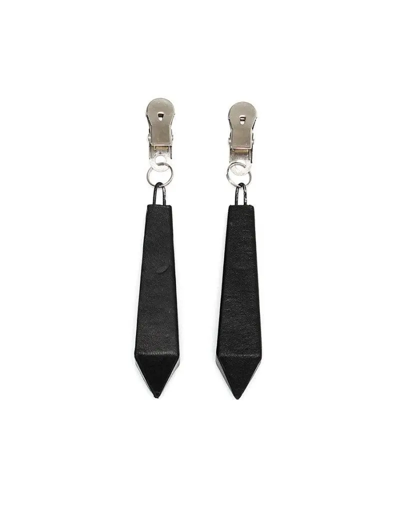 Tepelklemmen met aan elke klem een gewichtjen. Het gewichtje is bekleed met zwart leer.