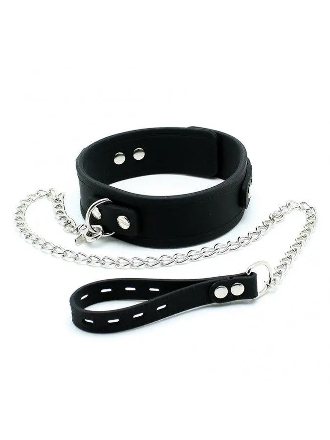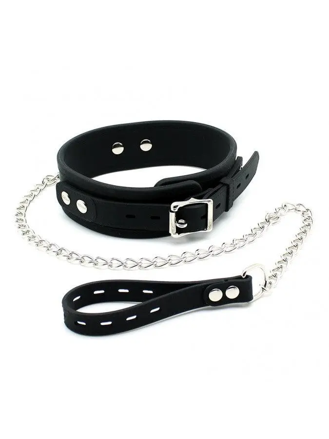 Stevige siliconen collar, voorzien van D-ring om je speelpartner aan te lijnen en mee te voeren. Inclusief metalen leiband.