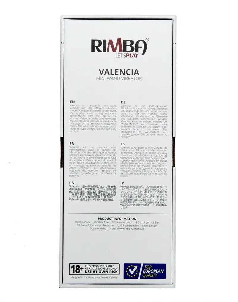 Valencia is een krachtige mini wandvibrator met 10 verschillende vibratiestanden. Hoewel de motor erg stil is, zendt de vibrator sterke trillingen uit die geconcentreerd op de bovenkant van de vibrator. Valencia kan worden gebruikt om spierstijfheid te verminderen, een aangename massage te geven of om de erogene zones te stimuleren. De wandvibrator is waterdicht, gemaakt van hypo-allergische siliconen en gemakkelijk schoon te maken.