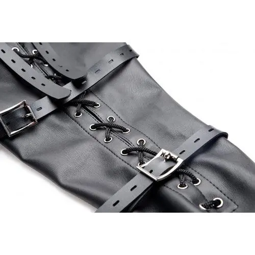 Met dit harnas wordt bewegen onmogelijk. Het zwarte harnas bindt de armen ver achter op de rug waardoor de drager ze absoluut niet kan bewegen. De binder wordt over de schouders bevestigd en is volledig verstelbaar. De gespen zijn voorzien van een kleine ronde openingen waardoor er een slotje doorheen kan. Dit geeft de ultieme controle. Onderaan de binder is een sterke D-ring bevestigd waar je je favoriete bondagetouwen en -kettingen aan kunt bevestigen.