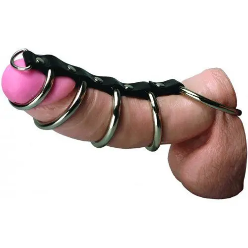 Verken je kuisheidsfantasieën met een uniek apparaat voor je plezier en amusement! Knijp de penis en ballen van je onderdanige in de basisring en schuif de rest van zijn penis door de andere vier ringen. Als hij een erectie krijgt, zullen de ringen er strak tegenaan liggen, waardoor hij pijnlijk voor je plezier wordt ingeperkt.