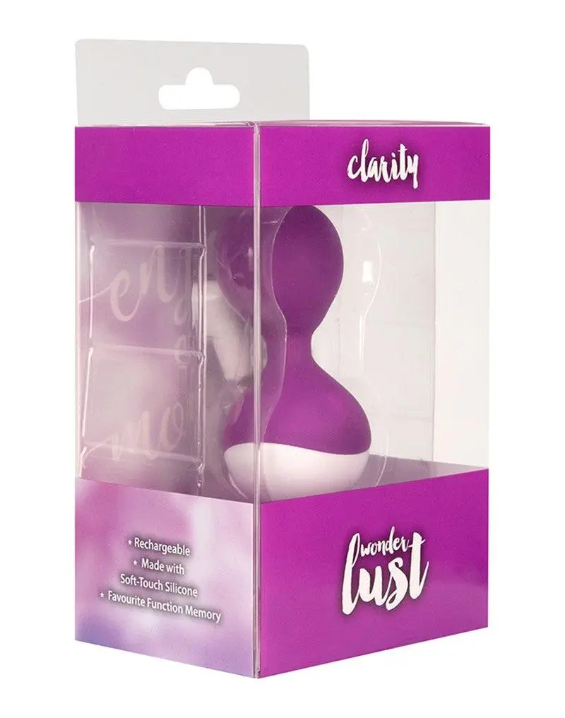 Clarity wordt gekenmerkt door een compacte vorm, die discreet en zorgvuldig ontworpen is. De gladde textuur geeft u een ongelooflijke sensatie en maakt het eenvoudig op zijn plaats te houden. Net als de rest van de Wonderlust collectie, is hij rustig, waterbestendig, oplaadbaar en aangedreven door PowerBullet die u toestaat om het overal te gebruiken waar en hoe u geinspireert wordt.